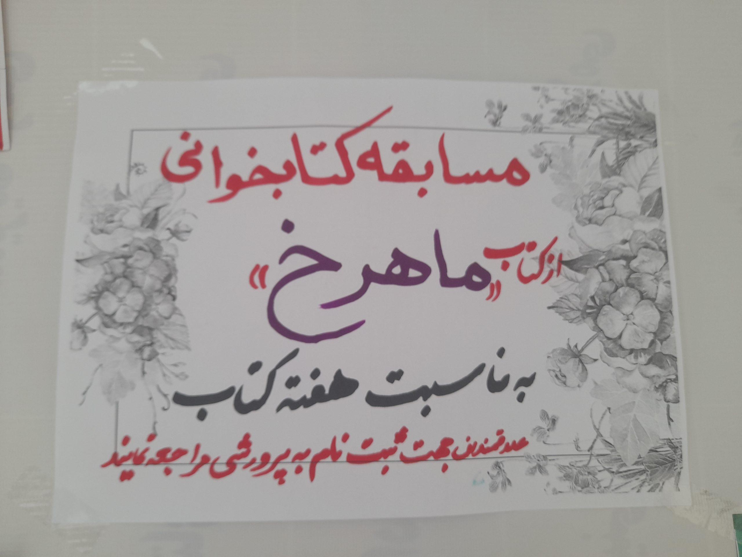 دبیرستان غیرانتفاعی دخترانه فرهنگ ایران به مناسبت هفته کتاب و کتابخوانی، نمایشگاهی از کتاب های فاخر معاصر و کلاسیک برگزار نمود و مسابقه کتابخوانی نیز بین دانش آموزان از کتاب ماهرخ برگزار شد.