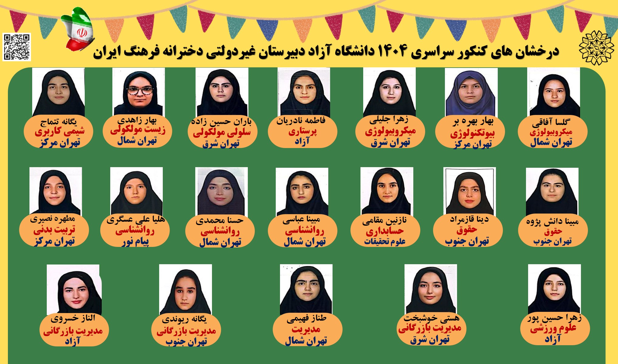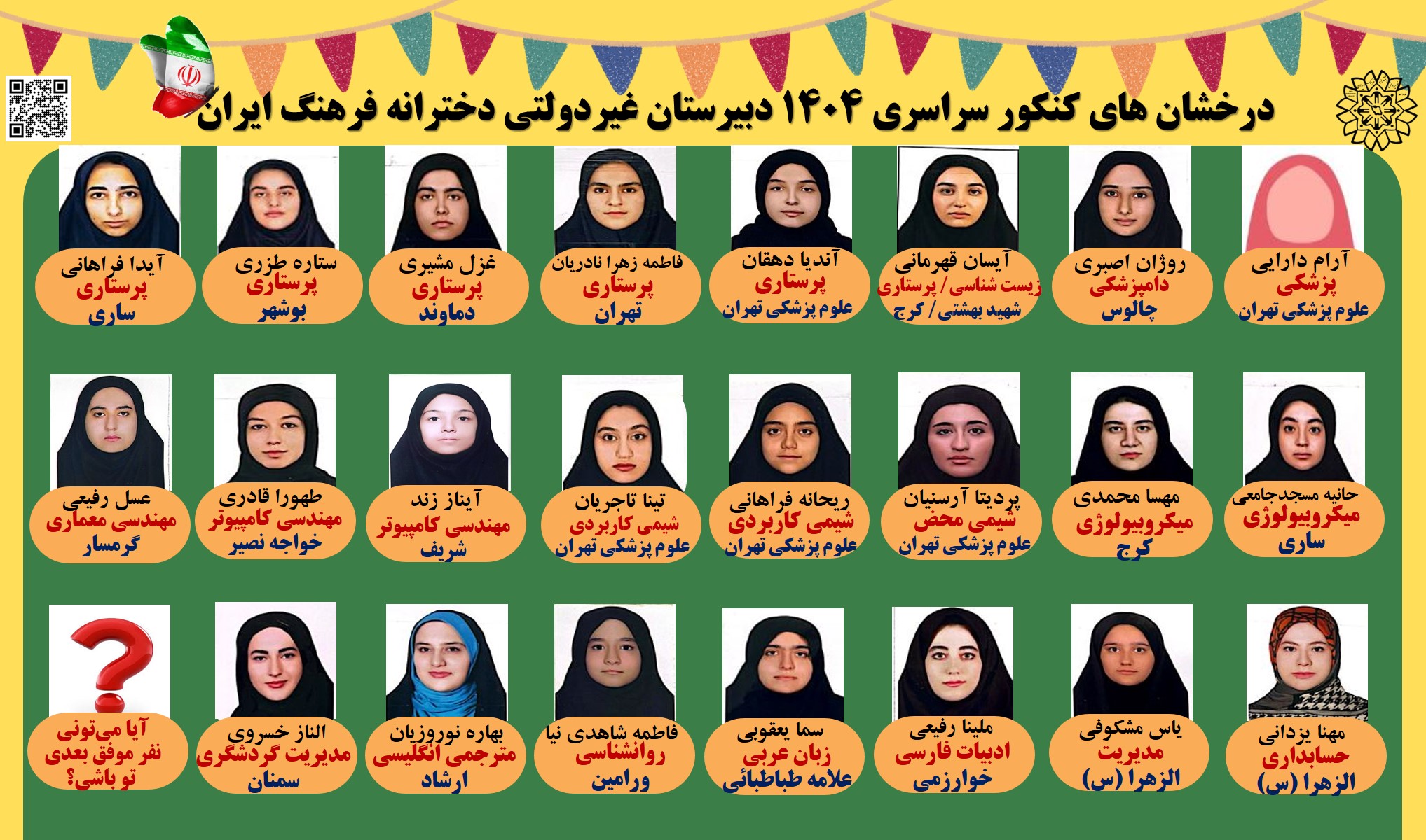 با افتخار، موفقیت چشمگیر دانشآموزان دبیرستان غیردولتی دخترانه فرهنگ ایران را در آزمون سراسری اعلام مینماییم.
